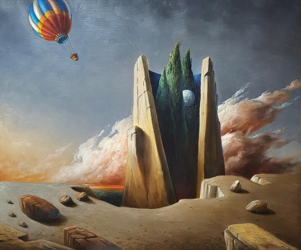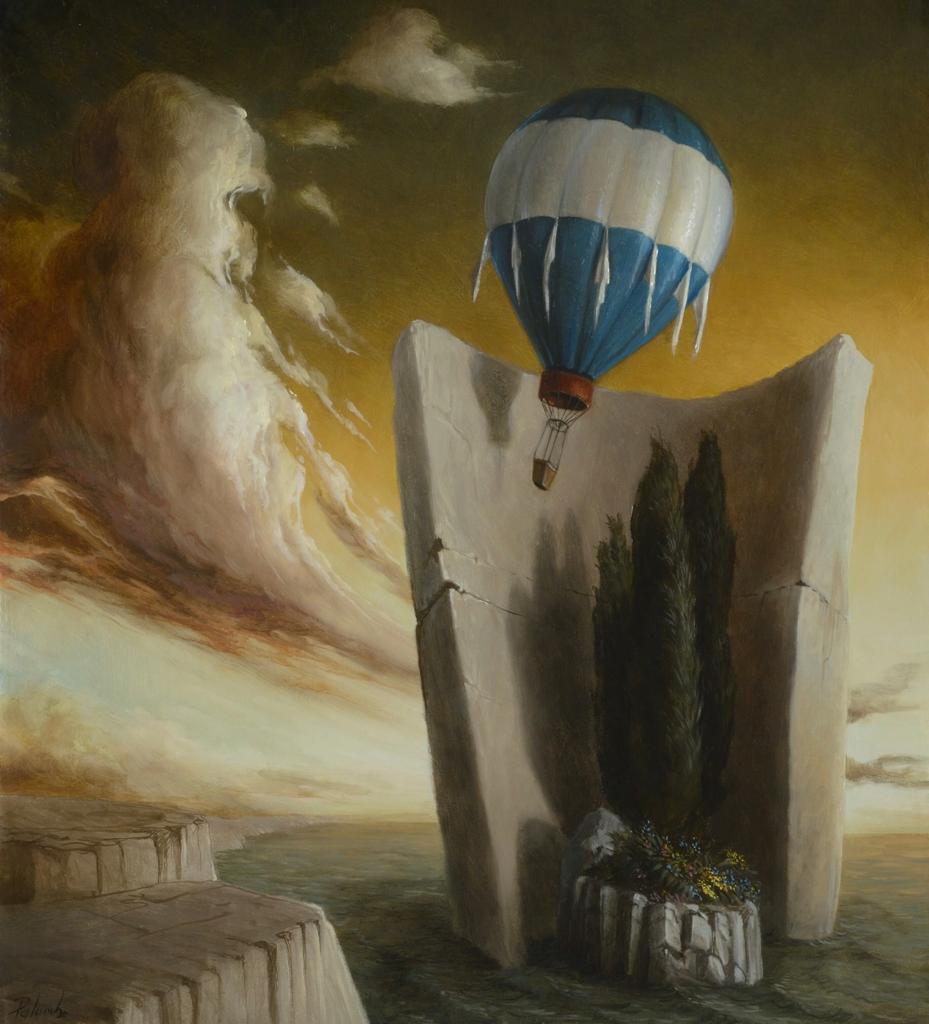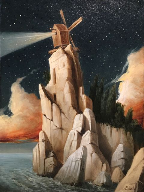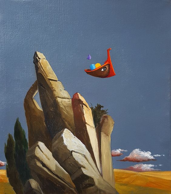 His artistic career is rich and multifaceted following the footsteps of the Giorgio de Chirico and Alberto Savinio and getting inspired by Arnold Böcklin’s imagery made of islands, seascapes and cypress trees. He reinvents those foundations with unusual interpretations: his works are full of oneiric and metaphysical symbols and phantasmagorical stages. No reality seems more authentic than the dream Palumbo depicts.